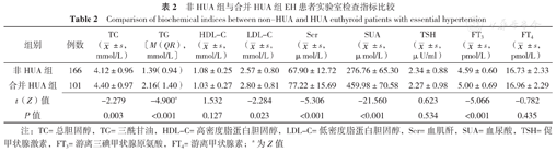 Comparison of biochemical indices between non-HUA and HUA euthyroid patients with essential hypertension