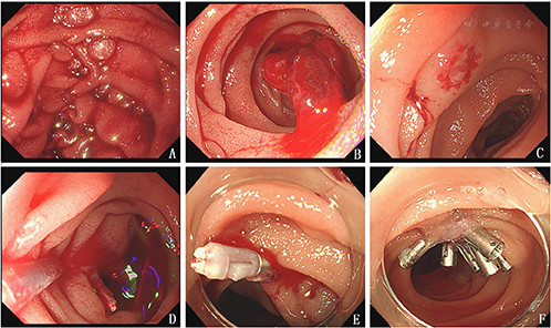 注:A示十二指肠及空肠近段肠腔内见大量鲜红色血液,B示退镜,冲洗、吸引观察,于空肠上段发现一浅表凹陷性溃疡伴凝血块附着,C示溃疡表面无炎性改变,见搏动性出血,D示注射硬化剂止血,E、F示钛夹止血