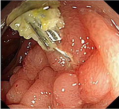 诊疗过程:入院后针对患者间断性便血,给予抑酸、止血、输血、补液、支持等治疗后便血未见明显缓解。入院后第3天急诊行SBE检查示:十二指肠及空肠近段肠腔内见大量鲜红色血液,进镜至空肠距幽门约1.5 m未发现出血灶(图1A)。退镜,冲洗、吸引观察,于空肠上段发现一大小为0.5 cm×0.5 cm的浅表凹陷性溃疡,缺损中间有血管走行,表面可见凝血块附着(图1B),且有搏动性出血,无明显炎性改变,考虑为Dieulafoy溃疡(图1C)。注射硬化剂止血(图1D)并联合钛夹止血(图1E、F),确认出血停止后结束治疗。术后继续辅以输注悬浮红细胞,并进行抑酸、保护胃黏膜、调节肠道菌群等综合治疗。术后腹部X线平片示钛夹位于空肠上段(图2),腹部增强CT未见明显异常。患者的病情逐渐平稳要求出院回家休养。1个月后复查SBE,Dieulafoy溃疡完全愈合,两枚钛夹残留(图3),继续随访7个月未再出现便血症状。