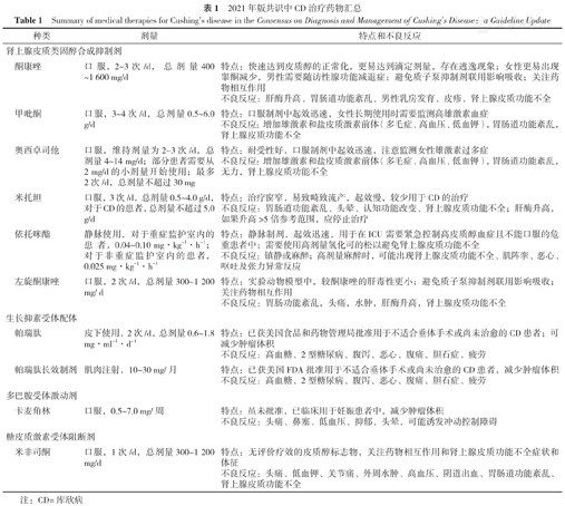 | 米非司酮 | 口服,1次/d,总剂量300~1 200 mg/d | 特点:无评价疗效的皮质醇标志物,关注药物相互作用和肾上腺皮质功能不全症状和体征不良反应:头痛、低血钾、关节痛、外周水肿、高血压、阴道出血、胃肠道功能紊乱、肾上腺皮质功能不全 | |