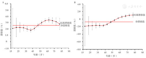 注:误差棒代表局部漂移值的95%可信区间;红色虚线表示净漂移值的95%可信区间;A表示乳腺癌发病率,B表示乳腺癌死亡率