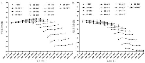 中国女性乳腺癌年龄别发病率的出生队列分析结果显示,从总体变化趋势上看,乳腺癌年龄别发病率随出生年份推移呈先上升后下降的趋势。分年龄组来看,各年龄段女性乳腺癌发病率随着出生队列呈上升趋势,其中25~34岁年龄组波动最大,呈先迅速上升再缓慢下降后缓慢上升趋势。中国女性乳腺癌年龄别死亡率的出生队列分析结果显示,总体乳腺癌年龄别死亡率随出生年份的推移呈下降趋势。分年龄组来看,≥65岁年龄段女性随出生队列呈略微增加趋势但变化不大;35~64岁年龄段女性随出生队列呈略微下降趋势;20~34岁年龄组女性波动情况较大,呈先上升后下降趋势;15~19岁年龄组女性乳腺癌死亡率随出生队列呈现先下降后趋于平稳的趋势(图2)。