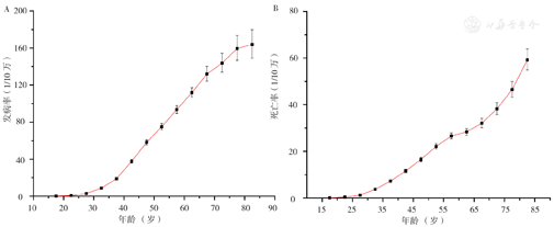 注:A表示乳腺癌发病率,B表示乳腺癌死亡率