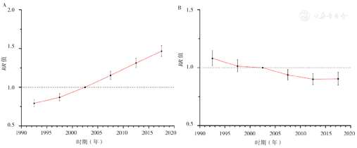 以2000—2004年时期组为对照组(RR值为1),乳腺癌发病风险的时期效应总体呈上升趋势,RR值从0.79〔95%CI(0.75,0.84)〕上升至1.47〔95%CI(1.40,1.54)〕。女性乳腺癌死亡风险时期效应总体呈下降趋势,RR值从1.08〔95%CI(1.02,1.15)〕降至0.90〔95%CI(0.85,0.96)〕(图4)。