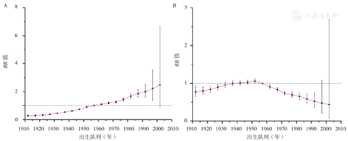 以1955—1959年出生队列组为对照组(RR值为1),乳腺癌发病风险的队列效应显示总体呈单调缓慢上升趋势,RR值由1910—1914年出生队列组的0.27〔95%CI(0.21,0.36)〕上升至2000—2004年出生队列组的2.48〔95%CI(0.92,6.67)〕。死亡风险的队列效应显示,1910—1954年出生女性中队列效应呈缓慢递增趋势,RR值由1910—1914年出生队列组的0.78〔95%CI(0.65,0.93)〕上升至1950—1954年出生队列组的1.06〔95%CI(1.01,1.12)〕;1950—2004年呈现逐步下降趋势,RR值从1950—1954年出生队列组的1.06〔95%CI(1.01,1.12)〕降至2000—2004年出生队列组的0.44〔95%CI(0.07,2.69)〕(图5)。
