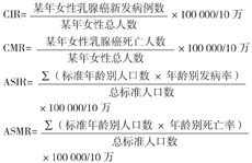 本研究提取了GBD2019数据库中有关1990—2019年中国≥15岁女性乳腺癌粗发病率(crude incidence rate,CIR)、粗死亡率(crude mortality rate,CMR)、年龄标化发病率(age-standardized incidence rate,ASIR)与年龄标化死亡率(age-standardized mortality rate,ASMR)等指标,其中标准化数据是以全球年龄标准化人口权重为参照[7]。统计指标具体计算公式如下: