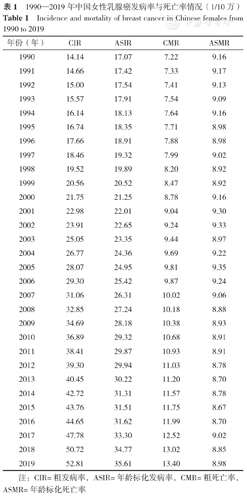 乳腺癌位居全球女性因癌死因首位,2020年全球乳腺癌标化发病率为47.8/10万,标化死亡率为13.6/10万[1]。乳腺癌不仅可对女性造成严重的身心伤害,而且可给患者、家庭及社会带来沉重的疾病负担。一项疾病负担时间趋势分析结果表明,乳腺癌伤残调整寿命年(disability adjusted life years,DALY)率和潜在减寿年数(potential years of life lost,PYLL)率分别从1990年的248.21/10万、238.60/10万升至2019年的412.49/10万、376.06/10万[2]。目前大多数疾病流行特征相关研究仅对不同时间的年龄别发病率或死亡率等数据进行传统描述分析,无法消除或控制年龄、时期、队列因素之间的交互作用。年龄-时期-队列(age-period-cohort,APC)模型改进了传统疾病描述分析方法,在同时调整年龄、时期和队列等因素的条件下估计人群疾病发病或死亡危险及其变化趋势[3]。基于此,本研究收集1990—2019年中国女性乳腺癌发病和死亡资料,采用APC模型了解乳腺癌随年龄、时期和队列变化的长期趋势,以期减轻乳腺癌带来的疾病负担,为乳腺癌的防治提供科学依据。