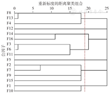 选择频率>5%的症状进行因子分析,结果显示,KMO值为0.755(>0.5),P<0.001,提示变量之间存在差异,可以进行因子分析。提取特征值>1的公因子,共得到16个公因子,记作F1、F2、F3……F16,对总方差的贡献率为68.057%。基于组间连接方法,测量方法为平方欧氏距离,进一步对16个公因子作系统聚类分析,获得树状图后,截距选择为19,共得到7类症状组合,见图1。F12(舌淡白、苔白)症状较少,无辨证意义,故予剔除,最终得到6类症状组合,记为C1、C2……C6。保留旋转后成分矩阵中因子载荷系数≥0.3的症状,结合专业知识,推断出6个潜在证候,见表3。