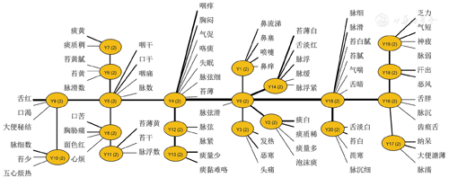 | Z6 | -2 121.44 | Y6、Y7、Y9 | 痰黄、口渴、舌红、苔黄、苔黄腻、脉滑数 | 痰热壅肺证 |