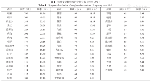 咳嗽变异性哮喘(cough variant asthma,CVA)是一种以咳嗽为主要或唯一症状的特殊类型哮喘,我国近1/3的慢性咳嗽与之相关[1,2,3],30.0%~35.7%的CVA患者会在5年内演变成典型哮喘[4,5]。中医药在治疗CVA方面疗效确切,能够有效改善患者临床症状、提高生活质量、减少CVA急性发作次数等[6,7,8,9,10,11]。辨证论治是中医立法处方、诊疗疾病的关键环节[12],开展证候诊断标准研究对于证候辨识度及中医整体辨治水平的提高具有重要意义[13]。临床常见证候的选择是证候诊断标准研究中的关键问题之一,其直接影响着所形成标准的准确性、实用性以及是否易于推广等[14]。基于此,本研究通过检索相关文献,初步探究CVA常见证候及其症状分布规律,以期为CVA临床实践及后续中医证候诊断标准建立相关的临床调查研究提供参考。