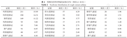 | 风邪犯肺证 | 211 | 15.89 | 肝火犯肺证 | 57 | 4.29 | 肺肾气虚证 | 26 | 1.96 |