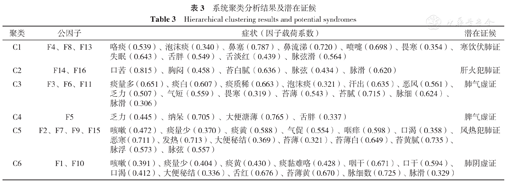 | C3 | F3、F6、F11 | 痰量多(0.651)、痰白(0.607)、痰质稀(0.663)、泡沫痰(0.321)、汗出(0.635)、恶风(0.561)、乏力(0.507)、气短(0.559)、畏寒(0.319)、苔薄(0.543)、苔腻(0.715)、脉细(0.624)、脉滑(0.306) | 肺气虚证 |