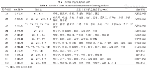 综合聚类:结合专业知识及小组讨论,对21个隐变量进行综合聚类并推断出12个潜在证候,包括风邪犯肺证、风寒犯肺证、风热犯肺证、风燥犯肺证、风痰恋肺证、痰热壅肺证、痰湿蕴肺证、肝火犯肺证、肺气虚证、肺阴虚证、肺脾气虚证、肾阳虚证,见表4。