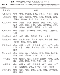 CVA常见证候有11个,分别为风邪犯肺证、风寒犯肺证、风热犯肺证、风燥犯肺证、痰热壅肺证、痰湿蕴肺证、肝火犯肺证、寒饮伏肺证、肺气虚证、肺阴虚证和肺脾气虚证,各证候的症状特征显著,可为临床辨证提供参考,为临床调查研究提供依据。