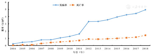 注:2004—2018年中国历年艾滋病发病率分别为0.248 9/105(2004年)、0.461 0/105(2005年)、0.545 8/105(2006年)、0.791 8/105(2007年)、0.812 2/105(2008年)、1.067 6/105(2009年)、1.283 0/105(2010年)、1.624 5/105(2011年)、3.322 7/105(2012年)、3.340 8/105(2013年)、3.572 6/105(2014年)、3.962 4/105(2015年)、4.261 0/105(2016年)、4.443 6/105(2017年)、4.956 9/105(2018年);2004—2018年中国历年艾滋病死亡率分别为0.060 5/105(2004年)、0.107 9/105(2005年)、0.108 9/105(2006年)、0.296 0/105(2007年)、0.419 6/105(2008年)、0.514 1/105(2009年)、0.609 2/105(2010年)、0.721 4/105(2011年)、0.903 3/105(2012年)、0.890 7/105(2013年)、0.933 3/105(2014年)、1.005 7/105(2015年)、1.090 6/105(2016年)、1.168 9/105(2017年)、1.431 2/105(2018年)
