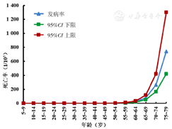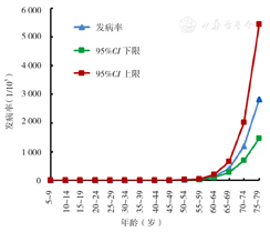 注:各年龄组发病率及其95%CI:5~9岁组为0.000 4/105(0.000 1/105,0.001 1/105)、10~14岁组为0.001 1/105(0.000 5/105,0.002 7/105)、15~19岁组为0.005 4/105(0.003 0/105,0.009 7/105)、20~24岁组为0.049 8/105(0.034 8/105,0.071 4/105)、25~29岁组为0.252 5/105(0.192 3/105,0.331 6/105)、30~34岁组为0.702 5/105(0.565 2/105,0.873 0/105)、35~39岁组为1.278 1/105(1.079 6/105,1.513 0/105)、40~44岁组为2.555 6/105(2.250 4/105,2.902 2/105)、45~49岁组为4.990 8/105(4.466 1/105,5.577 0/105)、50~54岁组为14.588 2/105(11.867 3/105,17.933 0/105)、55~59岁组为37.087 3/105(27.870 2/105,49.352 6/105)、60~64岁组为133.557 8/105(93.948 6/105,189.866 5/105)、65~69岁组为420.275 2/105(272.878 6/105,647.289 0/105)、70~74岁组为1 185.118 9/105(698.246 3/105,2 011.477 5/105)、75~79岁组为2 828.828 5/105(1 470.761 6/105,5 440.902 6/105)