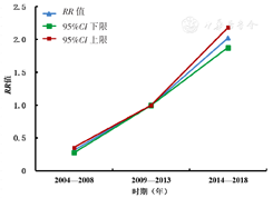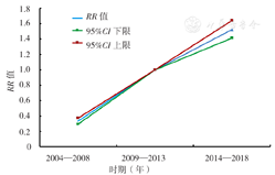 注:RR=率比;发病风险RR值及其95%CI:2004—2008年时期组为0.315 6(0.277 2,0.359 4)、2009—2013年时期组为1.000 0(1.000 0,1.000 0)、2014—2018年时期组为2.024 4(1.877 1,2.183 2)
