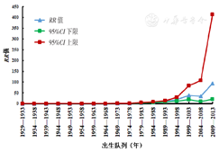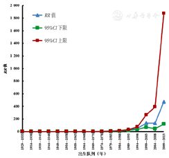 注:死亡风险RR值及其95%CI:1929—1933年出生队列组为0.000 1(0,0.000 6)、1934—1938年出生队列组为0.000 9(0.000 5,0.001 7)、1939—1943年出生队列组为0.003 0(0.001 8,0.005 0)、1944—1948年出生队列组为0.010 4(0.006 7,0.016 1)、1949—1953年出生队列组为0.033 1(0.023 0,0.047 5)、1954—1958年出生队列组为0.092 4(0.068 8,0.124 2)、1959—1963年出生队列组为0.216 3(0.170 8,0.273 9)、1964—1968年出生队列组为0.570 1(0.484 1,0.671 3)、1969—1973年出生队列组为1.000 0(1.000 0,1.000 0)、1974—1978年出生队列组为1.922 1(1.659 7,2.225 9)、1979—1983年出生队列组为3.605 4(2.984 7,4.355 2)、1984—1988年出生队列组为6.452 9(5.081 2,8.194 8)、1989—1993年出生队列组为10.623 7(7.821 3,14.430 3)、1994—1998年出生队列组为18.712 9(12.185 2,28.737 4)、1999—2003年出生队列组为38.917 9(18.241 4,83.030 9)、2004—2008年出生队列组为34.567 7(11.029 7,108.336 9)、2009—2013年出生队列组为93.634 5(21.168 0,414.182 4)