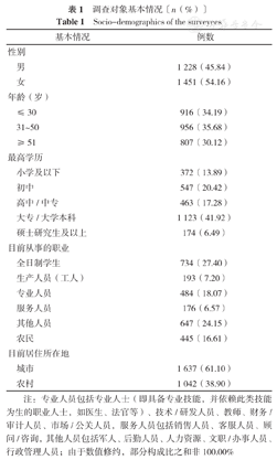 本研究共发放问卷2 846份,回收有效问卷2 679份,问卷有效回收率为94.13%。2 679例调查对象中,男1 228例(45.84%),女1 451例(54.16%);年龄≤30岁者916例(34.19%),31~50岁者956例(35.68%),≥51岁者807例(30.12%);1 123例(41.92%)最高学历为大专/大学本科;1 637例(61.10%)目前居住在城市(表1)。