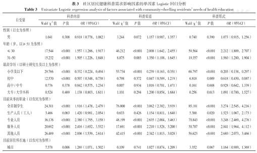 社区居民健康科普需求影响因素的单因素Logistic回归分析