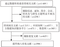 于2022-02-15,系统检索中国知网、万方数据知识服务平台、维普网,以"(农村订单定向OR订单定向OR免费培养OR定向培养OR订单)AND(医学生OR医学毕业生)"为检索式进行主题检索,检索时限为2010-01-01至2021-12-31。文献纳入标准:(1)研究内容聚焦定向医学生培养;(2)中文文献。排除标准:(1)重复发表的文献;(2)综述、通知、简介、会议、资讯等文献资料;(3)与研究主题明显不相关的文献。初检共获得相关文献1 449篇,手动剔除综述、通知、简介、会议、资讯及与研究主题明显不相关的文献后,将其保存为NoteExpress格式,经NoteExpress软件去重,最终纳入符合标准的文献(n=598)作为研究样本(图1)。