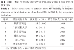 新医改启动以来,全面加强基层医疗卫生队伍建设受到国家及学术界的高度重视和关注,农村订单定向医学生(简称定向医学生)的免费培养则是加强基层医疗卫生队伍建设及提升基层诊疗服务能力的重要举措。为做好定向医学生免费培养工作,相关部门出台了一系列政策,如国家发展改革委等多部门于2010年联合印发了《关于印发开展农村订单定向医学生免费培养工作实施意见的通知》(发改社会〔2010〕1198号),2015年发印了《教育部等6部门关于进一步做好农村订单定向医学生免费培养工作的意见》(教高〔2015〕6号),2019年印发了《关于做好农村订单定向免费培养医学生就业安置和履约管理工作的通知》(国卫科教发〔2019〕56号)等政策文件,为定向医学生的培养提供了强有力的政策保障,党的十九大报告强调要"加强基层医疗卫生服务体系和全科医生队伍建设",为定向医学生的培养指明了方向。由于我国全科医学的发展起步较晚,当前仍存在培养体系不够健全、队伍数量不足、总体质量有待提高、体制机制有待完善、职业吸引力不足等问题[1]。通过查阅文献,发现关于定向医学生的研究主要以现状调查、政策建议、描述性案例探究为主,基于文献计量学的信息可视化分析较为少见。本文基于文献计量学的研究方法,运用CiteSpace可视化分析软件来探索定向医学生培养领域的研究热点和趋势,为后续研究提供借鉴和参考。