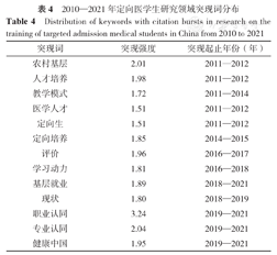 Distribution of keywords with citation bursts in research on the training of targeted admission medical students in China from 2010 to 2021