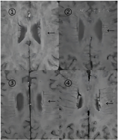 注:①中箭头所示为深髓静脉征(DMVs)不可见,DMVs总分0分;②中箭头所示为DMVs轻微可见,DMVs总分1分;③中箭头所示为DMVs中度可见,DMVs总分2分;④中箭头所示DMVs显著可见,DMVs总分3分