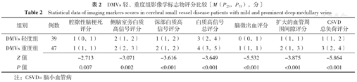 为观察DMVs总分及双侧DMVs的对称性与CSVD影像学标志物评分之间的相关性,根据入组患者的DMVs总分的中位数进行分组,DMVs总分<6分的为DMVs轻度组(n=39),DMVs总分≥6分的为DMVs重度组(n=47)。