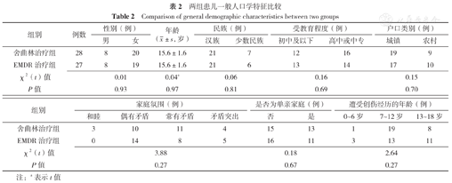 两组患儿性别、年龄、民族、受教育程度、户口类别、家庭氛围、是否为单亲家庭、遭受创伤经历的年龄比较,差异均无统计学意义(P>0.05),见表2。