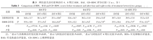 Comparison of BDI,BAI and CD-RISC scores before treatment and after four and eight weeks of treatment between two groups