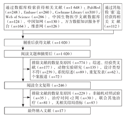 初始获得1 760篇相关文献(中文656篇,英文1 104篇),利用EndNote X9软件剔除重复文献740篇,通过阅读文献标题、摘要排除774篇,下载并阅读全文后去除229篇,最终纳入17篇文献[9,10,11,12,13,14,15,16,17,18,19,20,21,22,23,24,25],文献筛选流程见图1。