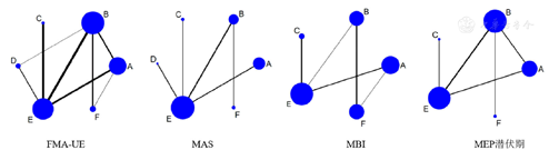 注:A为高频重复经颅磁刺激(HF-rTMS),B为低频重复经颅磁刺激(LF-rTMS),C为间断性theta节律刺激(iTBS),D为连续性theta节律刺激(cTBS),E为假刺激,F为常规疗法;FMA-UE=Fugl-Meyer运动评分量表上肢部分,MAS=改良Ashworth量表,MBI=改良Barthel指数,MEP=运动诱发电位