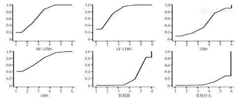 现有证据表明,在假刺激及常规疗法对照的基础上,LF-rTMS在改善脑卒中患者上肢运动功能、日常生活能力方面的效果优于HF-rTMS和iTBS、cTBS;iTBS对上肢肌张力的降低具有明显优势;HF-rTMS对皮质脊髓兴奋性的干预效果更佳。