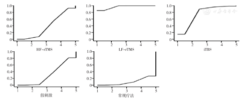 注:以上各图横坐标均为干预措施排序,纵坐标均为累积排序概率曲线下面积