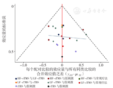 综上所述,现有文献证据表明,LF-rTMS相对于HF-rTMS、iTBS、cTBS可更有效地改善脑卒中患者的上肢运动功能、日常生活能力;iTBS降低脑卒中后上肢运动障碍患者肌张力的效果更佳;HF-rTMS干预在改善皮质脊髓兴奋性方面具有明显优势。同时鉴于以上局限性,后续可进行更多大样本量、规范性强且高质量的试验研究进一步验证本研究的结果,临床工作者应根据患者整体情况选择更为合适的rTMS干预模式,以达到更好的干预效果。