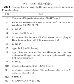 计算机检索PubMed、Embase、Cochrane Library、Web of Science、中国生物医学文献数据库、中国知网、万方数据知识服务平台、维普网中有关rTMS治疗脑卒中后上肢运动功能障碍的RCT,并通过追溯纳入文献的参考文献作为补充。检索时间均为建库至2022年2月,采用主题词和自由词结合方式进行检索。英文检索词包括:stroke、cerebrovascular accident、transcranial magnetic stimulation、theta burst stimulation、upper limb、upper limb motor dysfunction、randomized controlled trial。中文检索词包括:脑卒中、脑血管意外、中风、重复经颅磁刺激、theta节律刺激、上肢、上肢运动障碍、随机对照试验。以PubMed为例,其检索策略见表1。