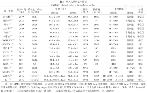 | 李冰洁[14] | 2016 | 20/20 | 51.5±7.1 | 51.4±6.6 | 23/17 | 25/15 | LF-rTMS | 常规疗法 | ①③④ |