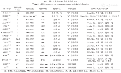 | 梁绮婷[10] | 3 | 90%~120% AMT | 900 | 患侧C3、C4 | "8"字形线圈 | 20 min/次,持续治疗2周后休息2 d,持续8周 |