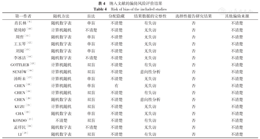 | 李冰洁[14] | 随机数字表 | 不清楚 | 不清楚 | 无失访 | 否 | 不清楚 |