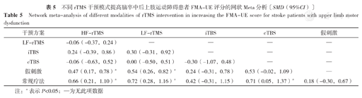 不同rTMS干预模式提高脑卒中后上肢运动障碍患者FMA-UE评分的网状Meta分析〔SMD(95%CI)〕