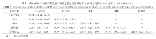 不同rTMS干预模式降低脑卒中后上肢运动障碍患者MAS评分的网状Meta分析〔SMD(95%CI)〕