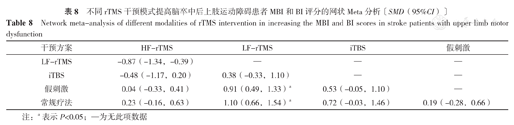 不同rTMS干预模式提高脑卒中后上肢运动障碍患者MBI和BI评分的网状Meta分析〔SMD(95%CI)〕