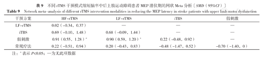 不同rTMS干预模式缩短脑卒中后上肢运动障碍患者MEP潜伏期的网状Meta分析〔SMD(95%CI)〕