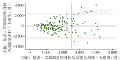 中文版HAHS-PAQ的总能耗、步行、爬楼梯和运动或休闲娱乐能耗的重测信度分别为0.504、0.570、0.711、0.429(P<0.05);中文版HAHS-PAQ与ActiGraph wGT3X-BT加速度计测量的每周总能耗、中高强度能耗和步行能耗的相关系数分别为0.441、0.258、0.312(P<0.05);Bland-Altman图结果显示,中文版HAHS-PAQ与ActiGraph wGT3X-BT加速度计测量的总能耗值的平均值为1 778.78,其中有94.6%(157/166)的点在95%CI以内。
