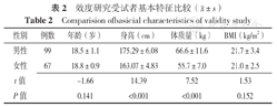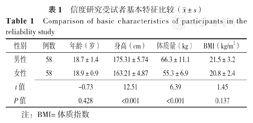 受试者年龄为18~19岁,身体素质状况良好,体质指数(BMI)处于参考范围。其中用于信度、效度研究的男性受试者身高、体质量均高于女性受试者,差异有统计学意义(P<0.05);男、女信度、效度受试者的年龄、BMI比较,差异无统计学意义(P>0.05),见表1、表2。