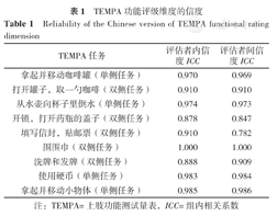 注:TEMPA=上肢功能测试量表,ICC=组内相关系数