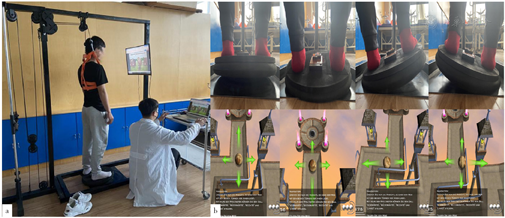 注:a为患者站立于平衡板上,在康复治疗师引导下进行核心康复训练;b中长箭头所指方向为虚拟对象运动方向