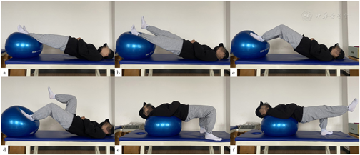 采用传统物理治疗床和Bobath球进行核心稳定训练。在进行正式的Bobath球训练之前,患者需要在指导下进行5 min与试验组一致的热身活动。在训练结束后进行5 min的静态拉伸训练作为放松活动。对照训练方法包括双桥运动、单桥运动、屈膝双桥运动、屈髋屈膝单桥运动、反桥运动、单腿反桥运动,每种训练动作完成后再依序进行下一种(图2)。训练中患者取仰卧位,在动作顶峰收紧核心肌群,保持等长收缩10 s后回归动作起始体位。每种训练动作重复3组,5次/组,每组间休息1 min,所有单桥运动左右侧交替进行。