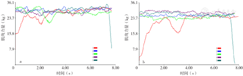 使用Hoggan MicroFet 2肌肉与骨骼检测仪测定干预前后患者上腹屈、下腹屈、脊柱伸、脊柱回旋肌群的等长收缩肌力及肌力。检测前须向患者讲解检测仪器与环境,并熟悉检测方法。(1)上腹屈肌力检测:患者采取仰卧位,全身放松,双手抱头,治疗师将手持检测仪放置于患者胸口平第4~5肋处,嘱患者尽全力前屈抬起胸廓,与检测仪持续对抗约8 s;(2)下腹屈肌力检测:患者采取仰卧位,全身放松,双手抱头,双腿并拢,治疗师将手持检测仪放置于患者髌骨上缘处,嘱患者尽全力屈髋抬腿,与检测仪持续对抗约8 s;(3)脊柱伸肌力检测:患者取俯卧位,全身放松,双上肢置于体侧,治疗师将手持检测仪放置于患者第4~5胸椎棘突处,嘱患者尽全力将胸廓下部抬起,与检测仪持续对抗约8 s;(4)脊柱回旋肌力检测:患者采取中立直背坐位,全身放松,双上肢自然垂于体侧,治疗师将手持检测仪放置于患者盂肱关节处,嘱患者分别尽全力左旋、右旋脊柱,与检测仪持续对抗约8 s。所测肌力数值均由软件自动记录,两种肌力检测均重复进行5次,取最大值。